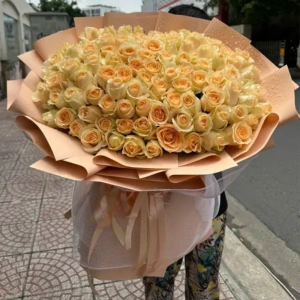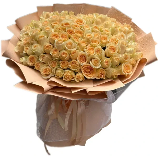 A magnificent bouquet of 100 fresh champagne roses, elegantly wrapped in premium nude paper and delicate mesh layers.
